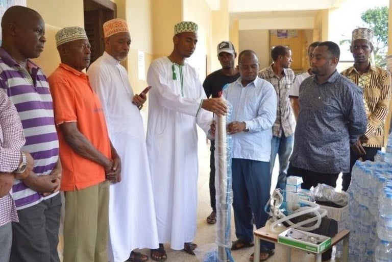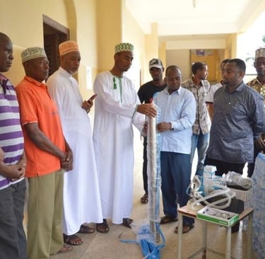 We supplied a new borehole pump along with some basic medical equipment. In the picture the cylindrical object is the borehole pump, being received by Khamis Bilal from the health ministry.