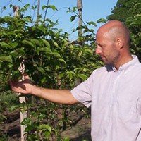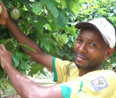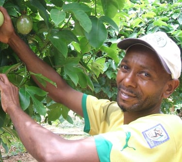 Jeroen de Boorder, shown here in the passion fruit grove he started on the Tanzania mainland, originated the Pemba Foundation's continuing drip-irrigation program.